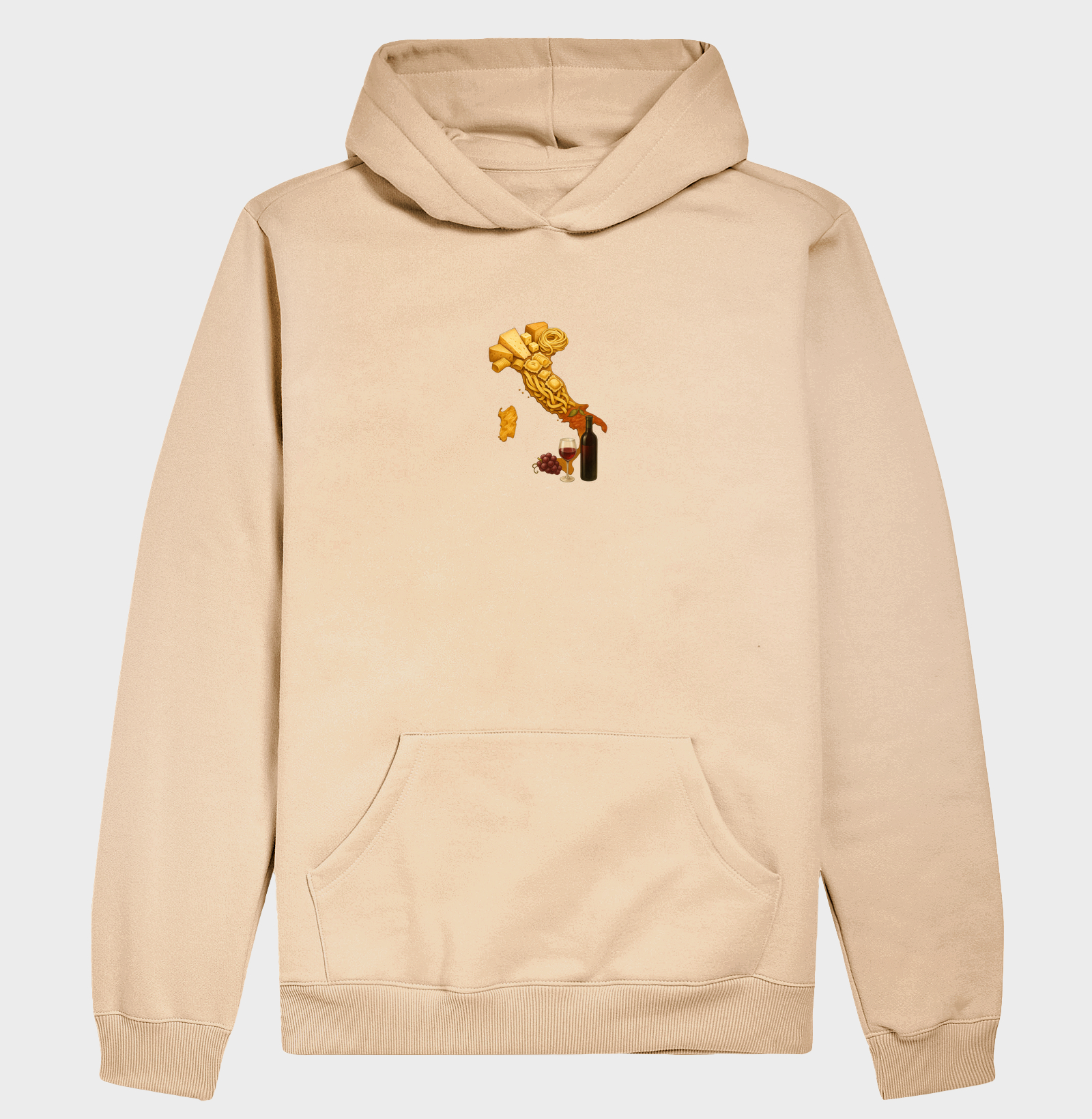 Uma Itália pra comer com os olhos. Nessa estampa, a silhueta da Itália é formada por ingredientes legítimos da sua tradição gastronômica: queijos no Norte, massas no Centro e vinhos no Sul e na Sicília. Do Parmigiano cortado em triângulos às tagliatelle enroladas em caracol, passando por garrafas de tinto com rótulo siciliano — cada detalhe foi pensado pra transformar o mapa em um prato de identidade cultural. A arte tem um tom conceitual e afetivo, que convida a “degustar a geografia italiana” sem pressa, entendendo cada ingrediente como um pedaço de história. Ideal pra quem ama comida, design e o jeito italiano de expressar tudo com sabor.