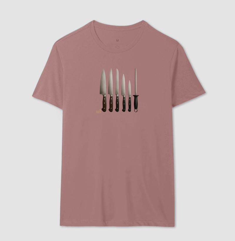Uma composição realista e simétrica que exibe seis utensílios essenciais para qualquer chef: cinco facas profissionais de diferentes tamanhos e funções (chef, fatiar, pão, desossar e legumes) acompanhadas por uma chaira de afiar. Todas estão alinhadas horizontalmente sobre uma superfície de madeira rústica, destacando o contraste entre o aço escovado das lâminas e a textura quente do fundo. Os cabos variam entre madeira escura e preto fosco com rebites metálicos, transmitindo robustez e elegância. A estética é minimalista, porém imponente — transmitindo técnica, precisão e o respeito pelo ofício culinário.