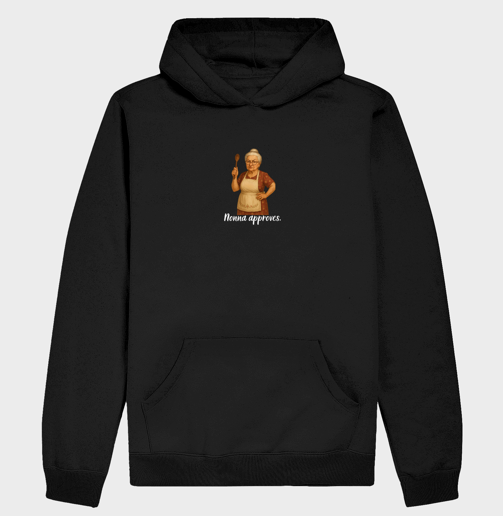 Quando ela segura a colher, ninguém discute. Nessa estampa, a Nonna surge com olhar sério e coração quente, segurando firme sua colher de pau — símbolo de autoridade, afeto e tempero bem dado. A frase “Nonna approves.” é um selo visual de qualidade afetiva: significa que o prato tá no ponto, a receita passou no teste e quem veste, fez tudo direitinho (ou quase). Com humor sutil e respeito absoluto, essa estampa é um tributo à figura que cozinha, educa, serve e julga — tudo ao mesmo tempo, e com amor.